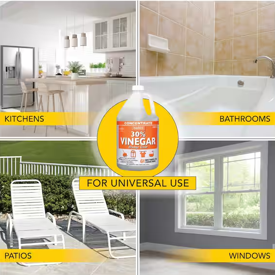Harris 30% Vinegar for home use contains absolutely no fillers or dyes. With 6X the power of standard vinegar, Harris Vinegar should be diluted 60 parts water to 1 part vinegar. Clean patios & driveways, eliminate odors from laundry, and so much more.