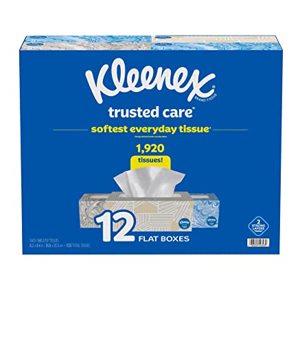 - 12 flat boxes of Kleenex Trusted Care Facial Tissues, each box containing 160 tissues—more sheets than before, packaging may vary from what is shown.