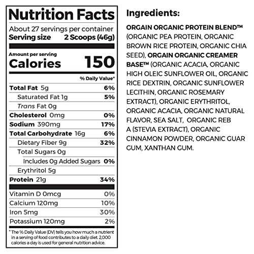 - 21 grams of organic plant based protein (pea, brown rice, chia seeds), 9 grams of prebiotic + fiber, low net carbs, 0 grams of added sugar, 150 calories per serving